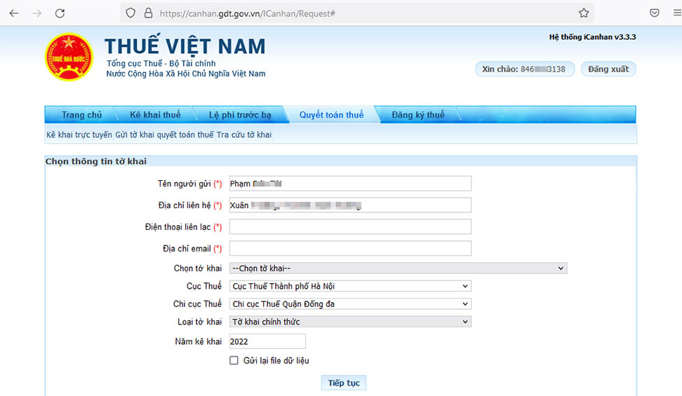 + Cục Thuế: Hệ thống điền tự động theo thông tin đăng ký